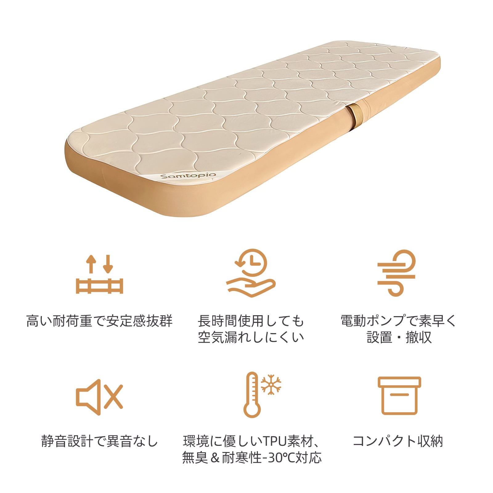 samtopia エアーベッド 電動ポンプ付き「最新鋭の独自技術 高性能エアーベッド」高さ10cm軽量 コンパクト 超快適・硬さ調整可能・-30℃まで対応・耐荷重500kg アウトドア キャンプ エアーマットレス 簡易ベッド 防災 車中泊 家庭用 来客用 収納袋付き